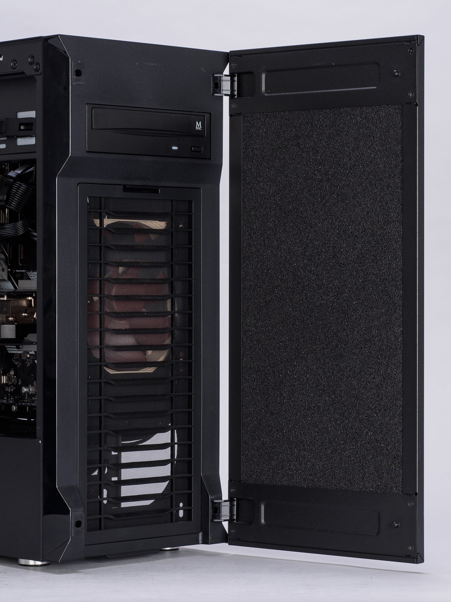 Silencio S600は前面から漏れる騒音を減らすため、フロントパネル内側に吸音材を装着。フロントパネル左右と下の隙間から吸気することで、前面の音漏れを最小限に抑えている。