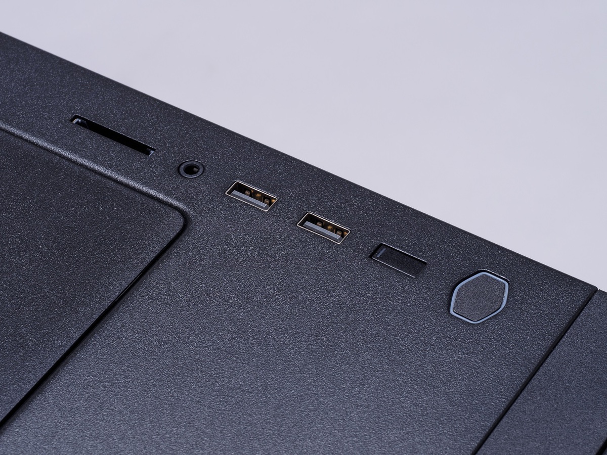 前面インターフェースは天面手前。USBポートはUSB 3.2 Gen 1に対応したType-Aが2基のみで、最近増えてきたType-C機器を接続できない点は惜しい。しかし、SDカードリーダーを標準搭載している点はすばらしい。いちいちSDカードリーダーを接続する必要がなく、スマートにSDカードを読み込める。