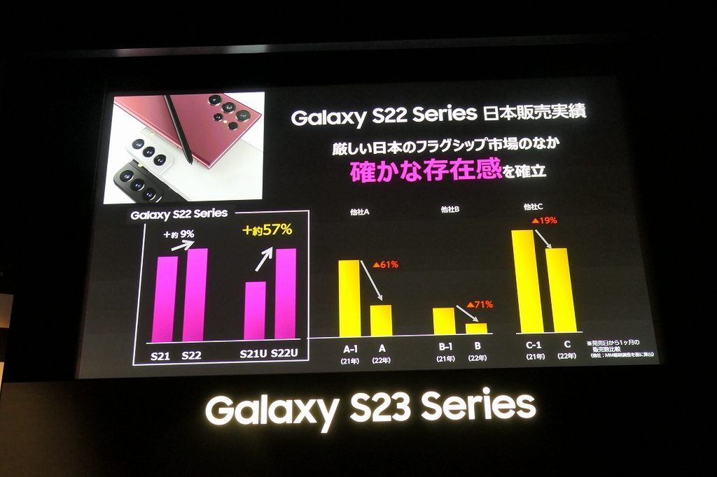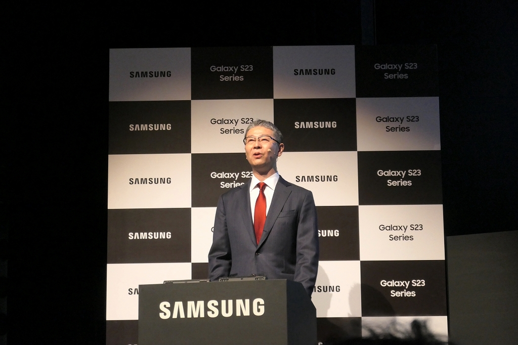 発表会の冒頭には、サムスン電子ジャパンのチーフ・マーケティング・オフィサー 小林謙一氏が登壇。昨年発売されたGalaxy S22シリーズの販売実績や、すでに海外で発売されているGalaxy S23シリーズが好調な売れ行きを示していることが紹介された。