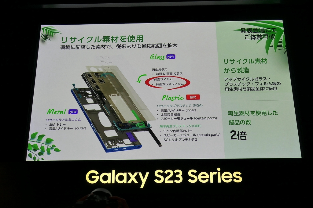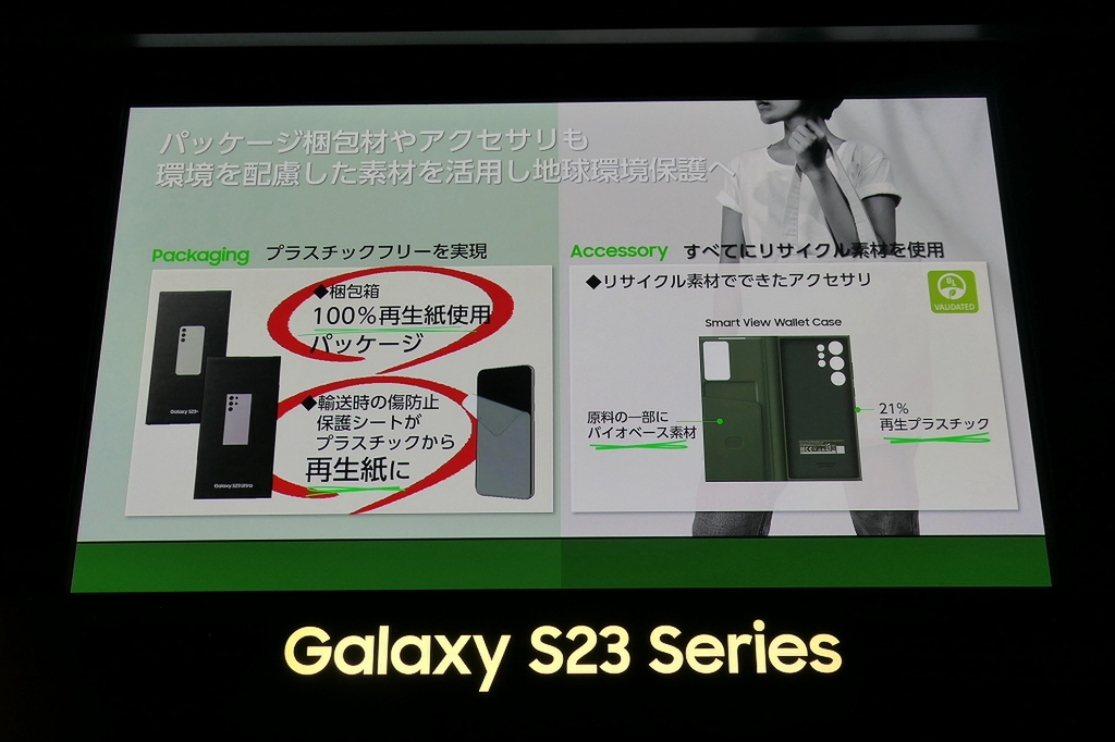 Galaxyは従来から内部の部品にリサイクル素材を使うなど、環境に配慮した製品開発を行なっている。Galaxy S23シリーズでは、内部だけでなく外装にも再生素材を使用。さらに、梱包材に再生紙を使うなど、SDGsへの取り組みを強化している。