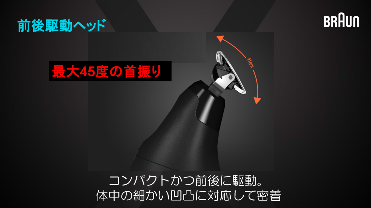 ヘッドは網刃とコーム刃を組み合わせてムダ毛を剃る仕組み。体の凸凹に対応するよう前後に最大45度の首振りをします。