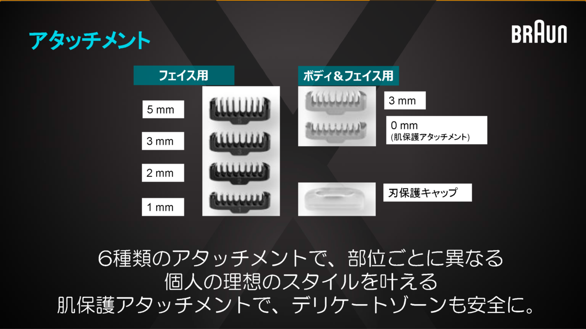 アタッチメントは合計6種類。フェイス用に1〜5mmの4種類、ボディ&フェイスに0mmと3mmの2種類、そして刃保護キャップが付いてきます。