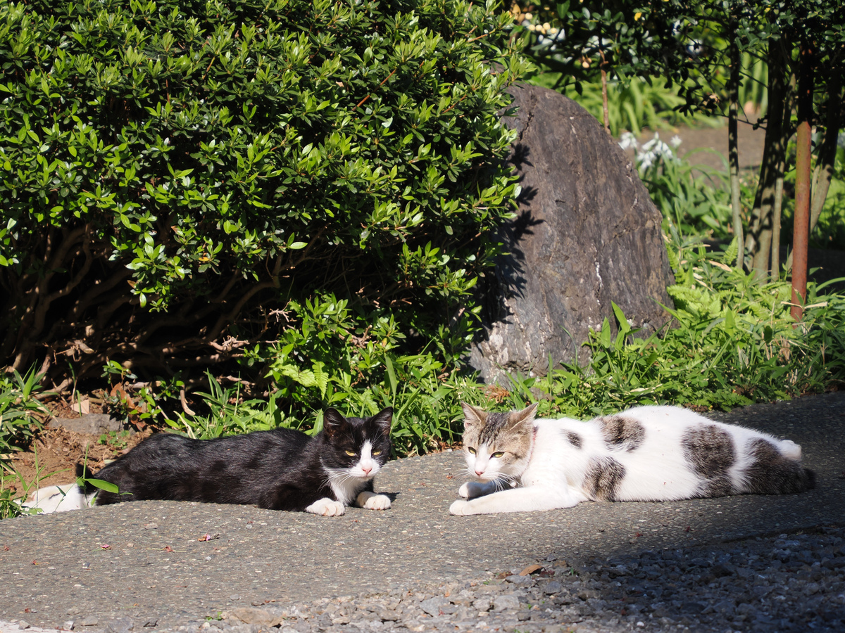 うららかな春の日に、これは微笑ましすぎるではないか。白とキジトラのブチ(まだら模様)のほうは首輪をしてるので飼い猫、ハチワレのほうは勝手に住みついてるのか。そんなことを考えてたら、ガン見しすぎたのか、見てるのがバレてしまった。2匹同時に「こっち見んな」って顔してるのがまたたまらん。