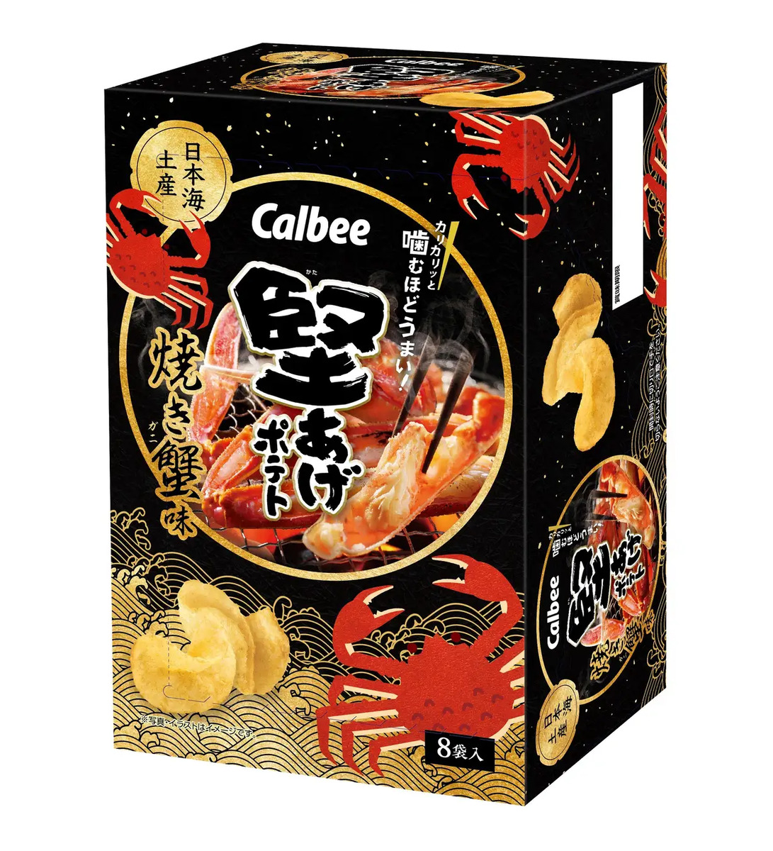 「堅あげポテト 焼き蟹味」は、日本海で水揚げされ絶大な人気を誇る「蟹」を甲羅ごと焼いた「焼き蟹」をイメージして作りあげたといい、噛むほどに蟹の濃厚な味わいが口いっぱいに広がる。