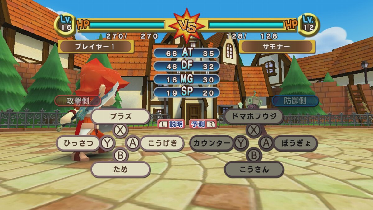 特定のマスに止まると戦闘が発生。モンスターを倒して経験値をためるとレベルアップする。戦闘は4つの行動から1つを選択するタイプ。「こうげき」なら「ぼうぎょ」、「ひっさつ」なら「カウンター」と相対する行動になっており、さらに魔法と職業専用コマンドが使える。どれを出すか、読みあいが重要に!