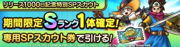 本SPスカウトでは「ハロウィンベロニカ」や「ロトの勇者」をはじめとした、過去に期間限定で登場したSランクキャラクターが必ず1体仲間になる。本SPスカウトを利用するためのSPスカウト券は、期間中のログインボーナスのほか、「リリース1000日記念特別セット」各種でも手に入れられる。