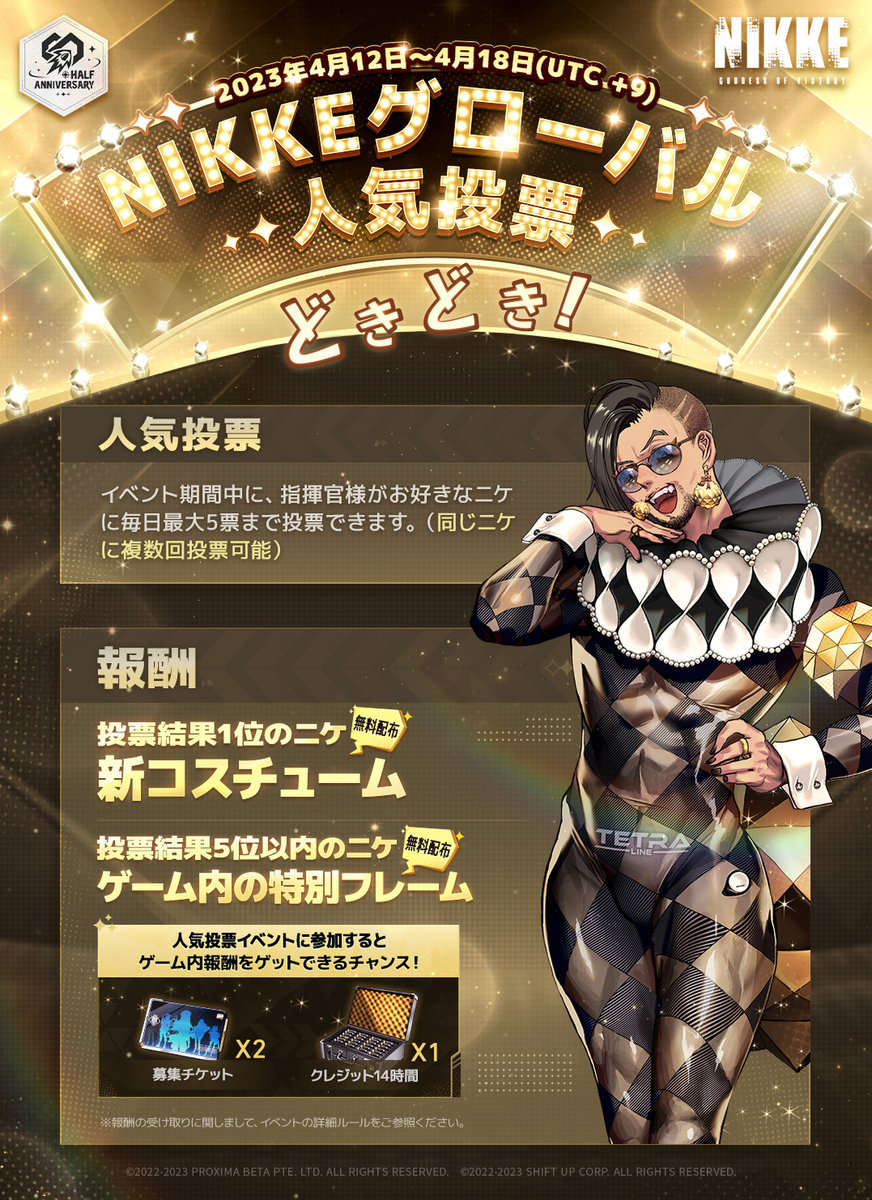 これに先駆けて、ハーフアニバーサリーを記念したNIKKE初のキャラクター人気投票イベント「どきどきっNIKKEグローバル人気投票」を本日より開始した。投票期間は、2023年4月18日までとなる。