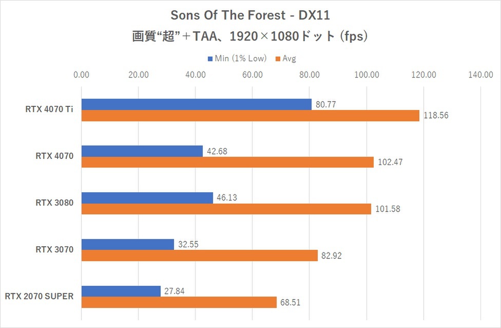 まずは「Sons Of The Forest」で試す。画質は“超”とし、アンチエイリアス“TAA”に設定。セーブポイントから一定のコースを歩いた際のフレームレートを計測した。