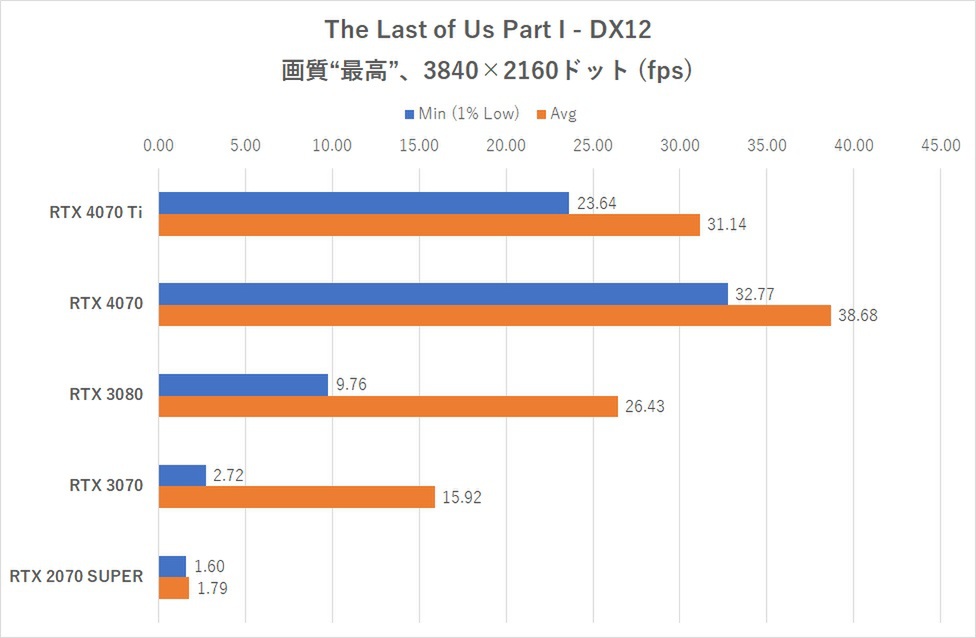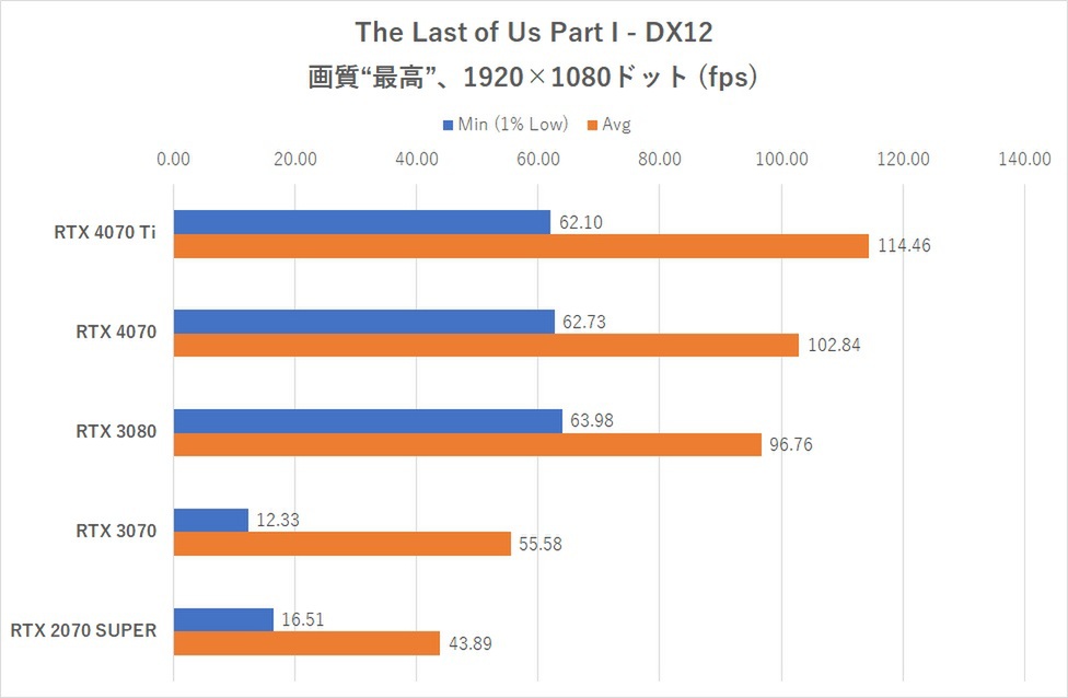 今回最後に試す「The Last of Us Part I 」は、まだパフォーマンス改善アップデートが入る前の状態で検証となった。次のグラフを見れば分かるが、結果は大荒れでGPUの序列を無視した結果が一部得られたため、「最適化アップデート前の参考値」程度に考えていただきたい。画質は“最高”に設定し、開始序盤、街を逃げ回るシーンにおけるフレームレートを計測した。