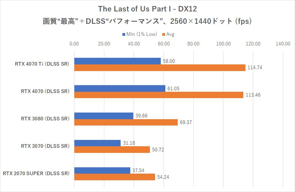 ここから先はDLSS SR対応タイトルでの検証となる。まず一通りDLSSなしで検証し、WQHDと4KのみDLSS SRの“パフォーマンス”設定で検証する。DLSS SRの仕様をWQHDから上の解像度と決めた理由は、RTX 4070のターゲットがWQHDゲーミングであるためだ。