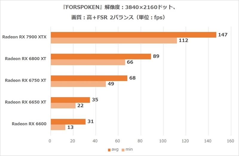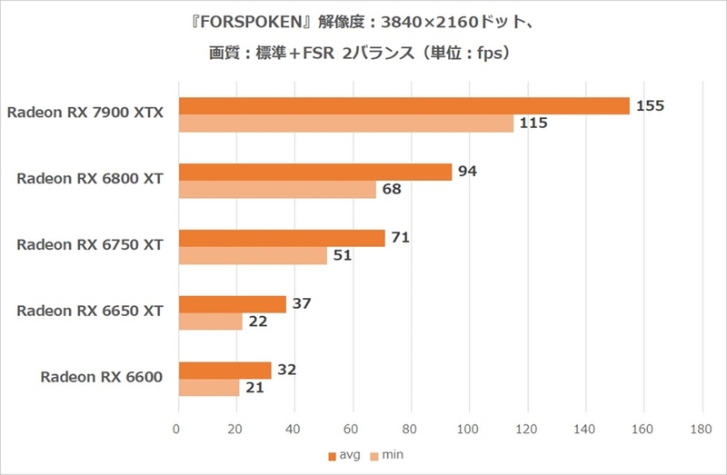 4K解像度では、Radeon RX 7900 XTXでも、平均フレームレートが60fpsを下回ってしまいFSR2を利用することで、ようやくフレームレートは快適なプレイを楽しめる平均105fps、最小80fpsとなった。