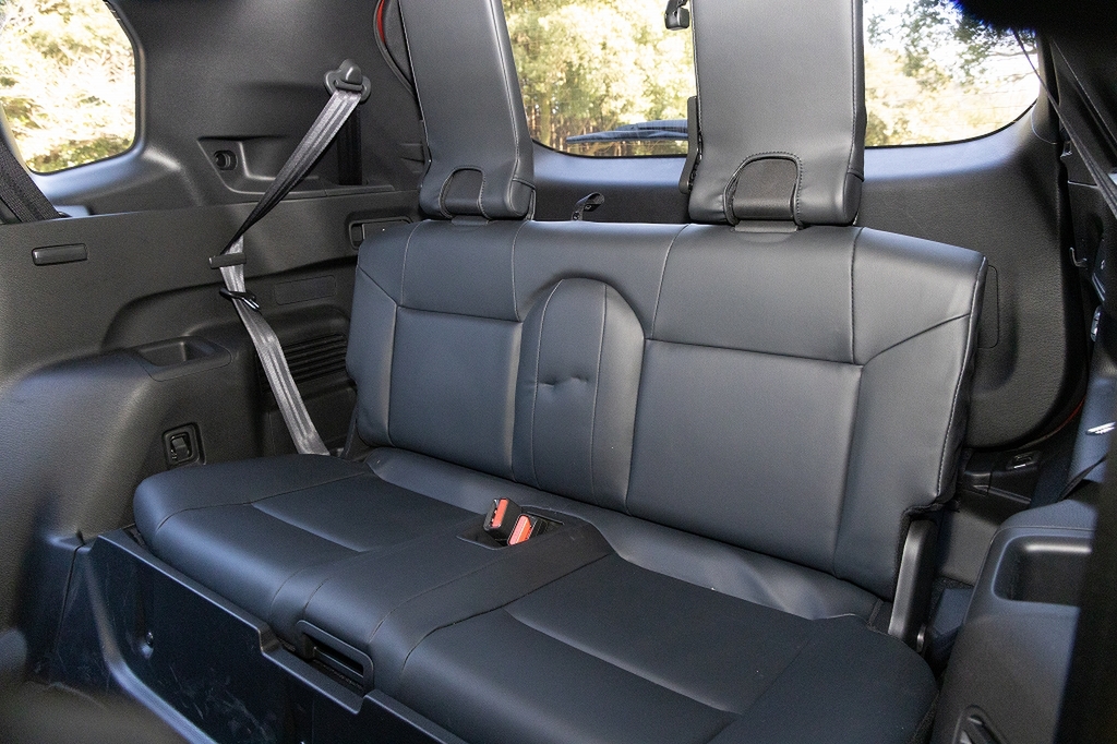 それでは、室内をチェックしましょう。まずは問題の3列目。まずは小柄なゆみちぃ部長が挑戦! ですが2列目シートを倒して乗り込もうとすると「これ……」と一言。まず、たどり着くまでが大変で、さらに座ろうとすると「座れないですよ。足が入らない!」と、笑いながら悲鳴をあげます。「小さなお子さんのためのシートですね」というのが部長の見解で、それはメーカー広報担当もキチンと認識しており「これは緊急用ですから」とのこと。