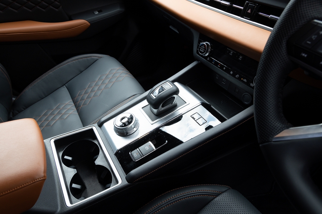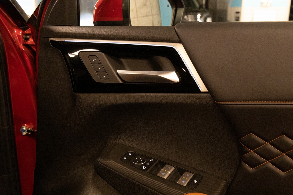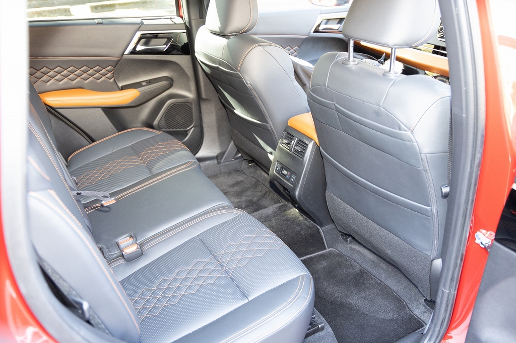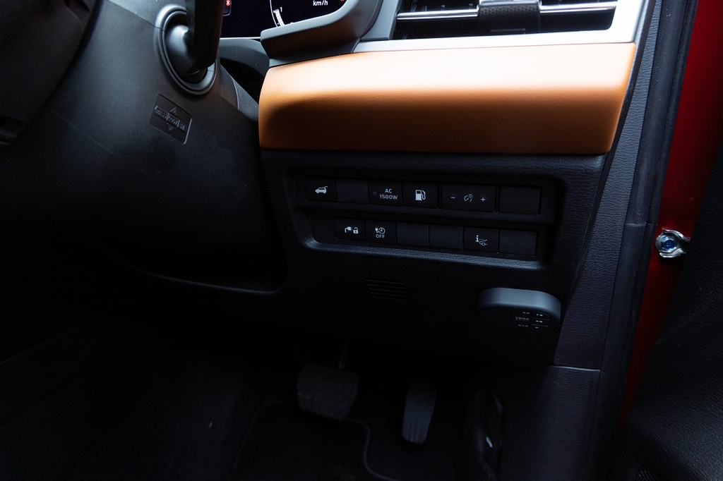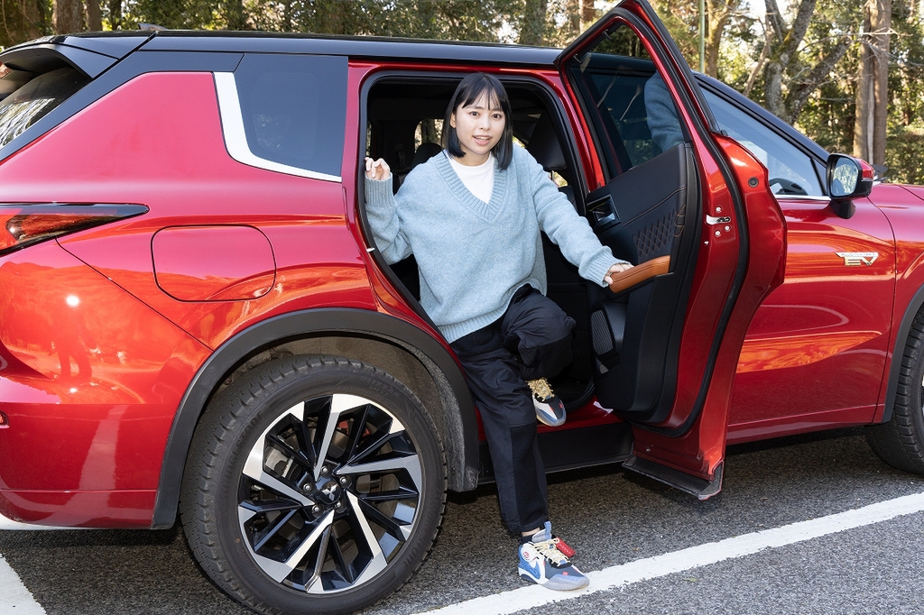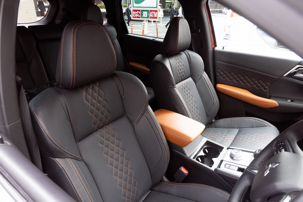 続いて運転席へ。「頼もしさを感じますね。それにイイモノ感がありますね」というように、直線基調のデザインと、そこに入るオレンジのラインにアウトドアテイストを感じられた模様。無骨といえば無骨なのですが、それが三菱らしいといえばらしいかなと。