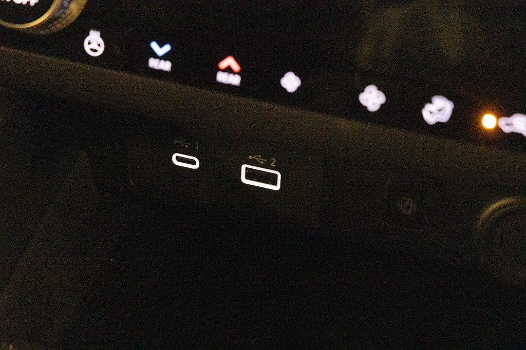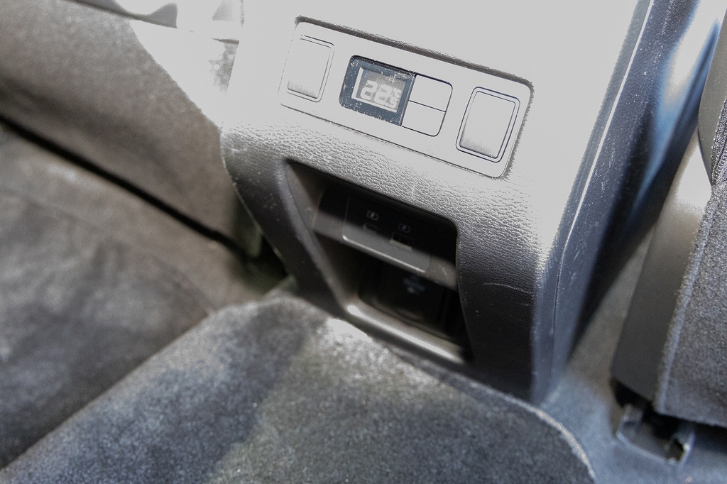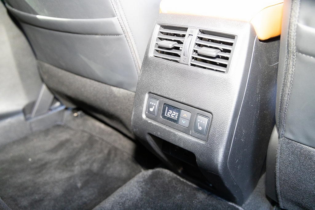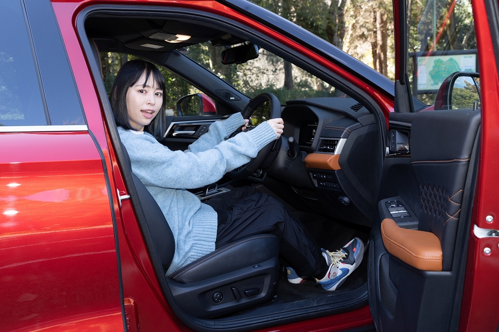 一方、2列目シートは快適そのもの。キルティングのような座面加工、オレンジのステッチに「これはオシャレ!」と笑顔をみせます。「すごくしっかりとして、でもフカフカなシートですね」とニンマリ。「これ、イイモノ感がすごいんですよ。驚きました」という言葉に嘘偽りナシ! アメニティも充実しており、USBのほか、ACアウトレットも用意されます。さらにプライバシーシェードも装備されているので「これは実にイイ!」と太鼓判の二重丸。