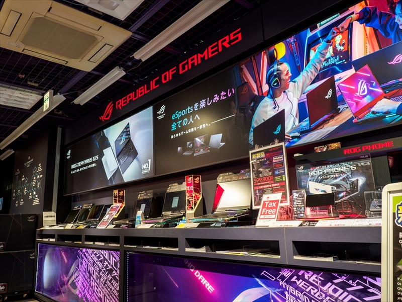 5FはeSportsで注目を集める、PCゲームをプレイするのに最適なゲーミングパソコンフロア。主要なPCメーカーごとにスペースが分かれ、ロゴとブランドイメージカラーで分かり易くなっている。