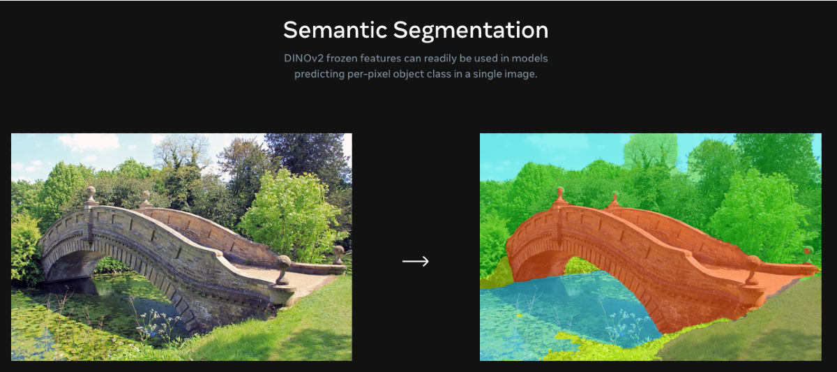 意味的セグメンテーションとは画像内の各ピクセルを特定のクラスに割り当てるタスク。これにより画像中の物体や領域を正確に識別しすることができる。DINOv2は微調整なしでも初見の画像をセグメンテーションすることが可能だ。