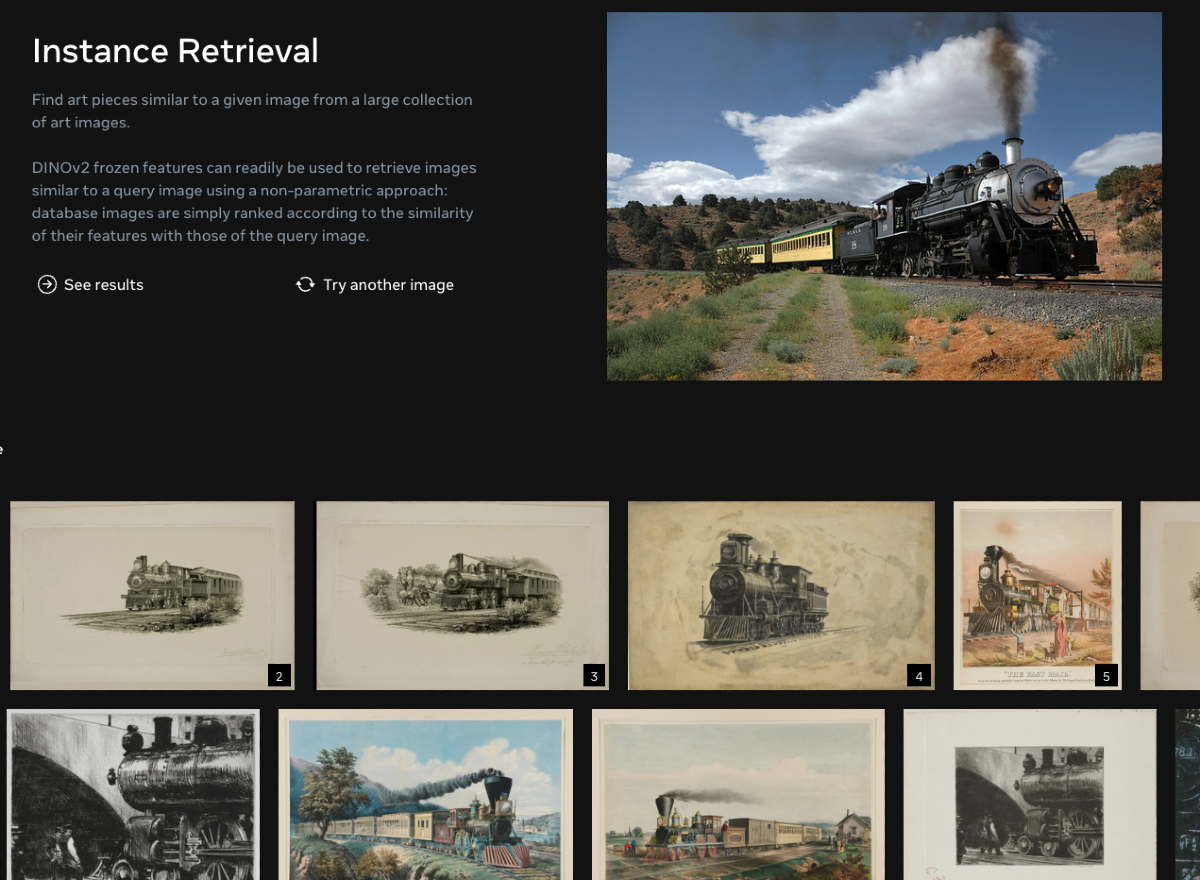 インスタンス抽出とは、多数の画像の中から特定の画像に似たものを抽出するタスク。DINOv2はすべての画像から特徴量を抽出し、類似性を計算してランク付けすることによってこのタスクを実現している。