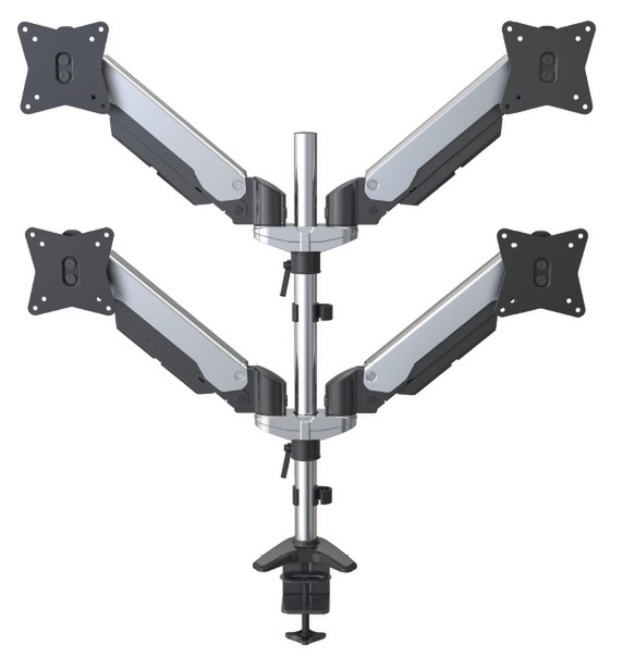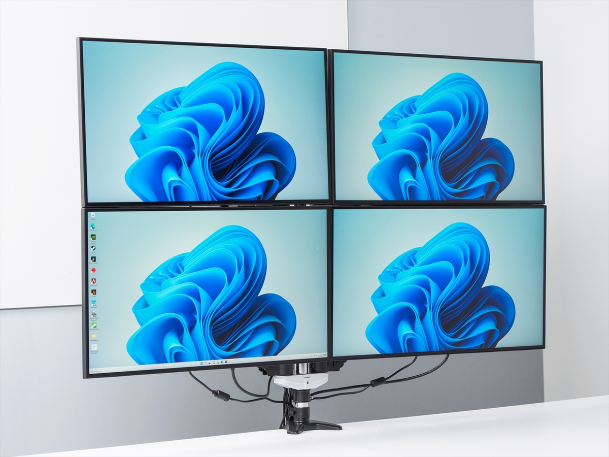 前提として、本稿で紹介する8K環境の構築には、4台の4Kディスプレーのほか、4台設置に対応したディスプレーアームと、映像出力端子を4系統備えるPCが必要となる。そこで、JAPANNEXTには別途、3軸ガス式クワッドディスプレーアーム「JN-ARM-GA44V」を手配していただき、4台のJN-27IPS4FLUHDR-C65W-HSPを縦2台・横2台で設置した。