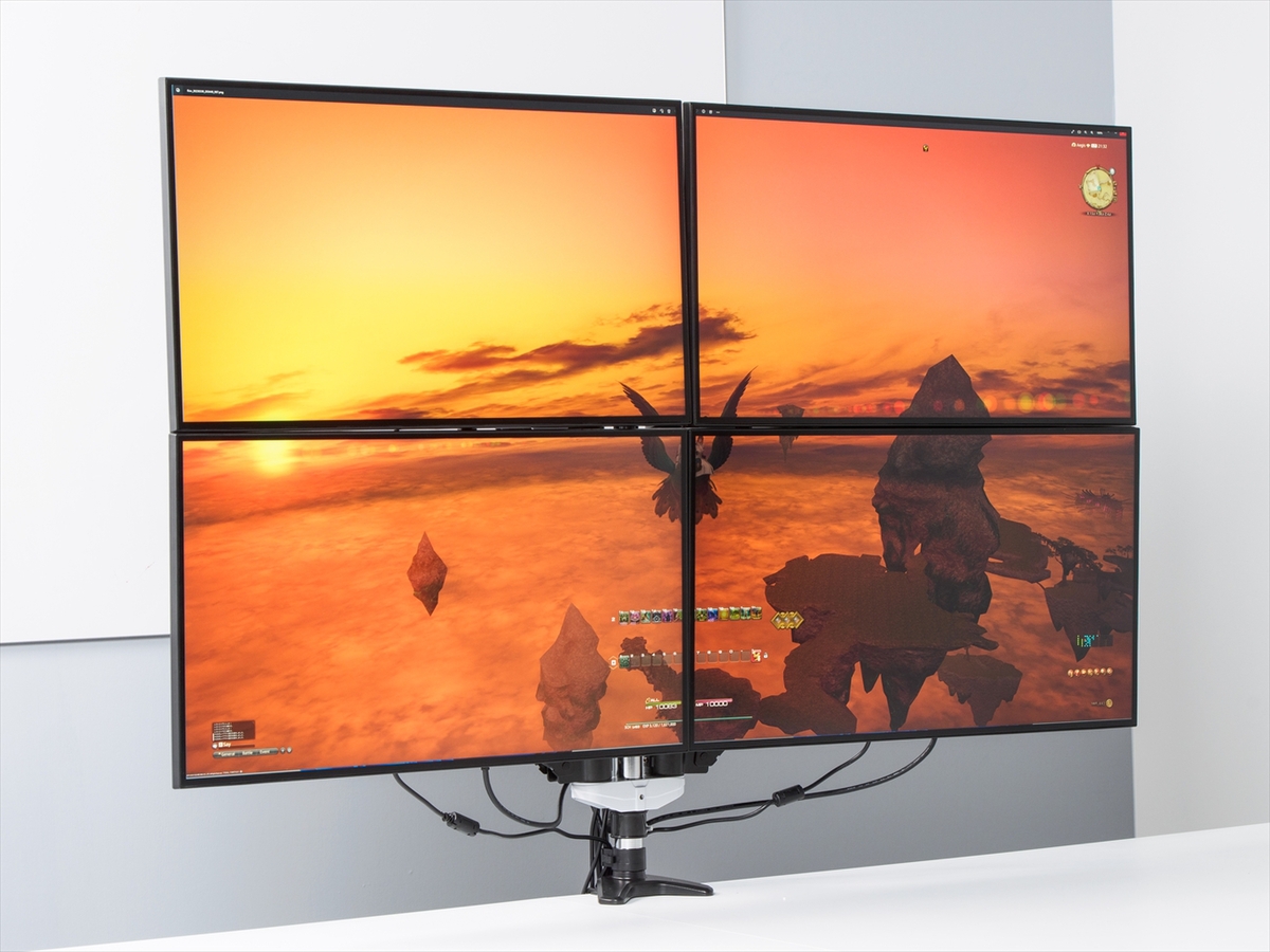 JN-27IPS4FLUHDR-C65W-HSPを4台用意し、アームに設置して最大解像度8K(7680×4320ドット)のマルチディスプレーを構築。27型4台の迫力はすさまじい。余談だが、セッティングは筆者と担当編集の2人がかりでおよそ1時間ほどだったが、1人なら倍以上の時間はかかること請け合いだ