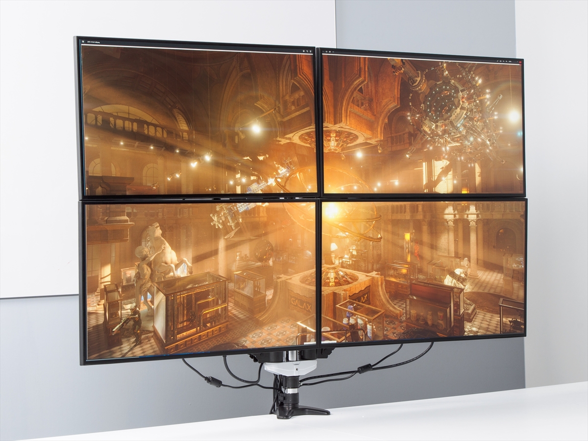 単体でも魅力的なJN-27IPS4FLUHDR-C65W-HSPだが、本製品の特徴とも言えるフレームレスデザインを活かす方法として、マルチディスプレーが適していることは先述の通り。というわけで、今回は本機を4台お借りして、最大解像度8Kの環境を構築してみた。これだけ同じ型番の機材をご用意していただけることはなかなかないので、JAPANNEXTのご担当者の方には本当に感謝しかない。