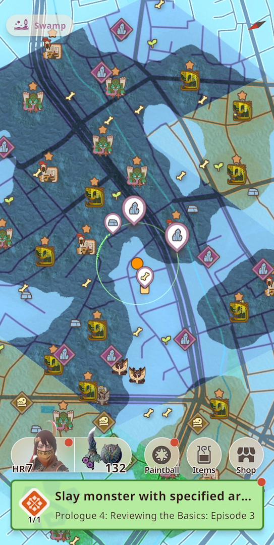プレイヤーの範囲内にいるモンスターにタップすると狩猟がスタート。モンスターにはランク(☆)が付与されていて、☆の数が多いほど強いことを表している。