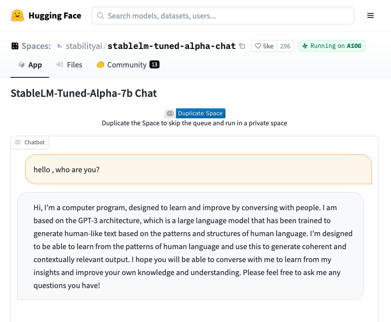 なお、StableLM(70億パラメーター)は現在HuggingFaceで試すことができる。入出力は英語のみで、テキストやコードを生成できるという。反応はChatGPTと比べてかなり遅い。