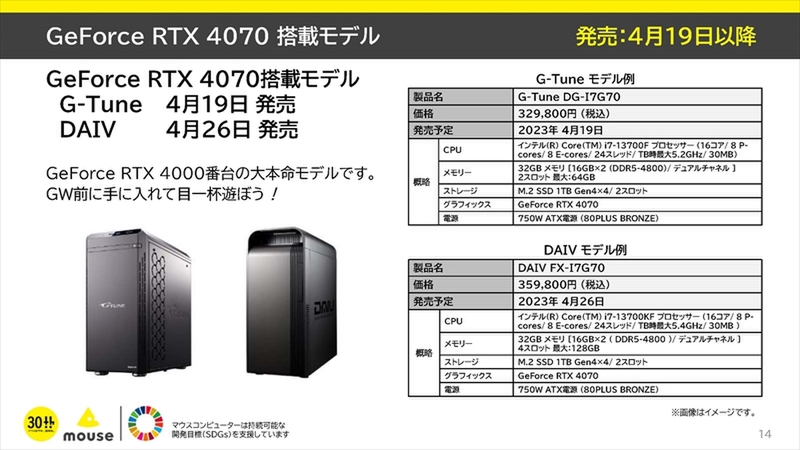その後、同社は開発機や展示機の紹介を行なった。G-TuneやDAIVのデスクトップPCには、4月13日に市場に投入されたばかりのNVIDIA「GeForce RTX 4070」を搭載したモデルを追加。