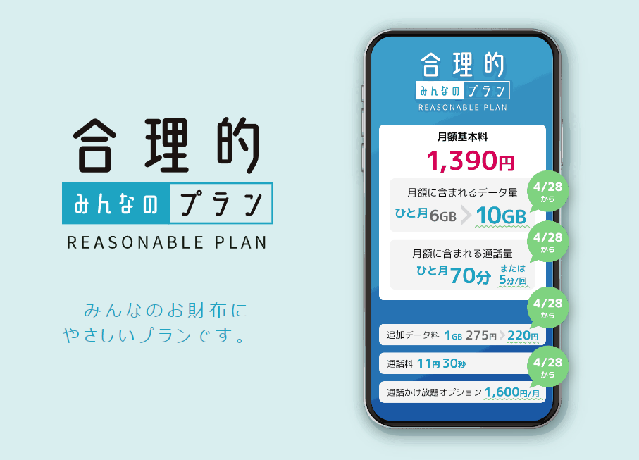 「合理的みんなのプラン」は2021年6月に提供が開始された料金プラン。月額基本料1390円で、6GBの高速データ通信と70分までの無料通話分が含まれている。