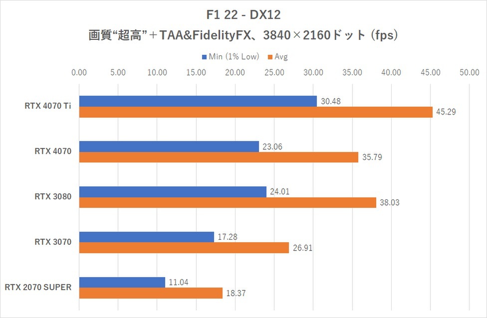 F1 22でもレイトレーシング込みの画質設定で検証したが、DLSSの力を借りなければRTX 4070は“若干遅いRTX 3080”のポジション止まりであることを示している。若干カクつくものの、WQHDであれば画質超高設定で平均70fps以上出せる点は評価できよう。ただ、フレームレートの安定感的にはRTX 4070 Tiのほうがはるかに良好なのは言うまでもない。