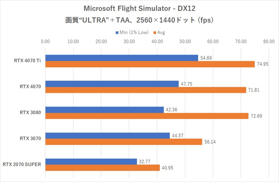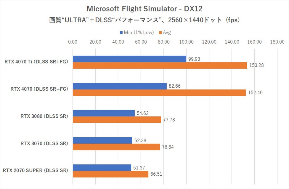 DLSSを使うとWQHDではフレームレートが伸びるが、4Kでは息切れしてしまうゲームもある中、このMicrosoft Flight SimulatorはDLSS FGに対応するRTX 4070が良い結果を残し続けているのは高く評価したいところだ。