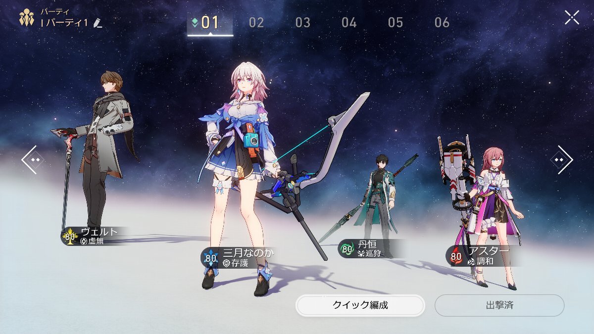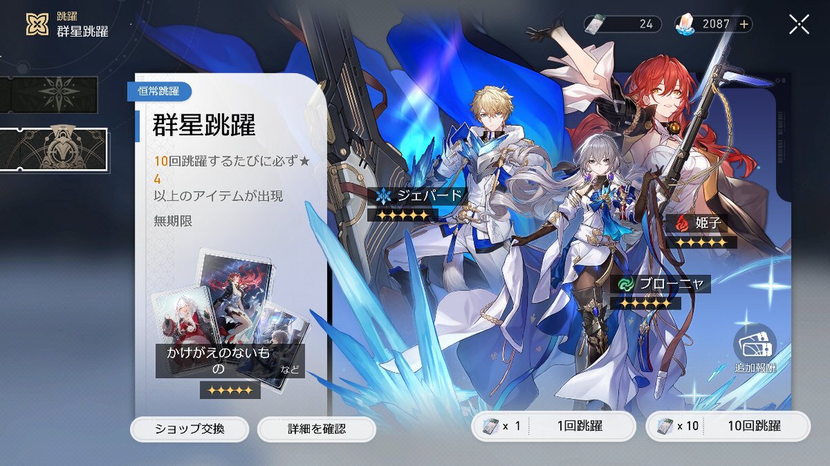 ストーリーで出会うキャラクター以外にも、「群星跳躍」(いわゆるガチャ)を利用することでも仲間を増やすことが可能。それぞれ特徴的な能力を持っているので、積極的に仲間を増やしていきたい。