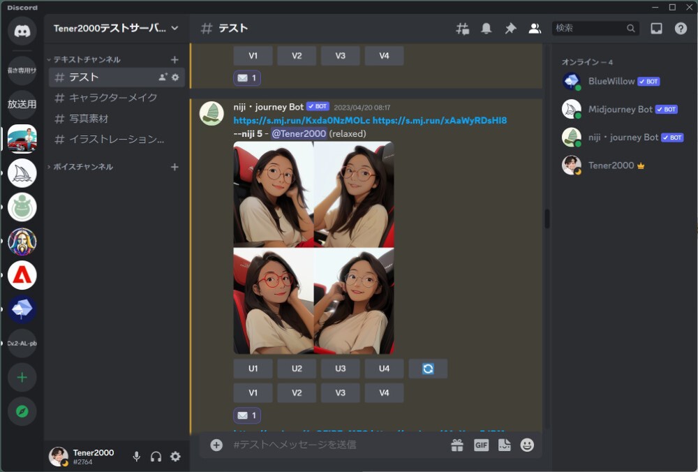 自分のサーバー内には、自分でチャンネルを作ることができるので、たとえばイラスト専用、写真専用、テスト用、趣味用、仕事用など、いくつかのチャンネルを作って、それぞれジャンルごとに分けて画像を生成することもできます。