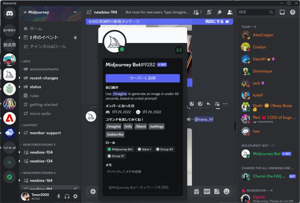 次に、「Midjourney」のサーバーに移動し、「newbiesチャンネル」にあるMidjourneyボットのアイコンを、どれでもいいのでクリック。