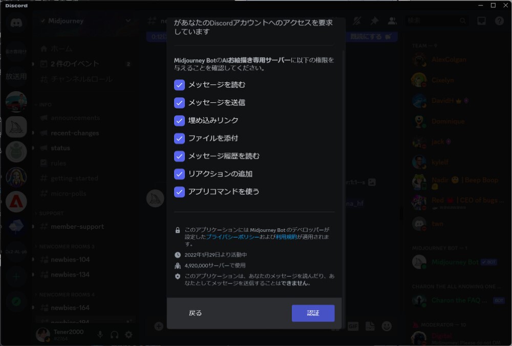 お絵描きサーバー内でのMidjourneyボットの権限はすべてにチェックを入れたまま、「認証」ボタンをクリック。