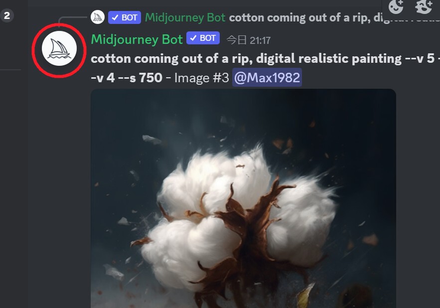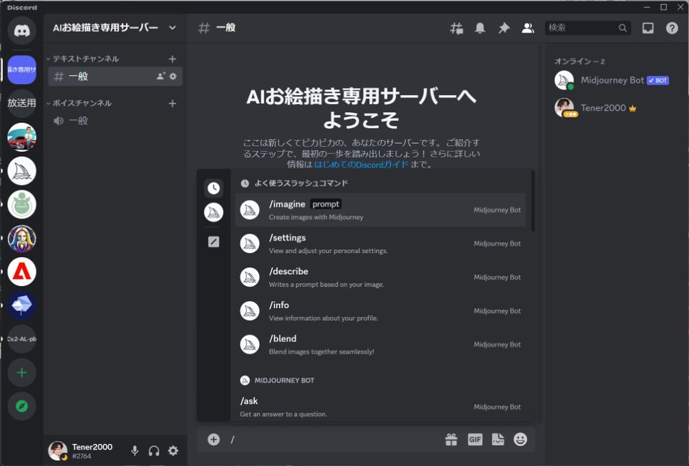 これで、自分のお絵描きサーバー上で、Midjourneyボットにコマンドが出せるようになりました。