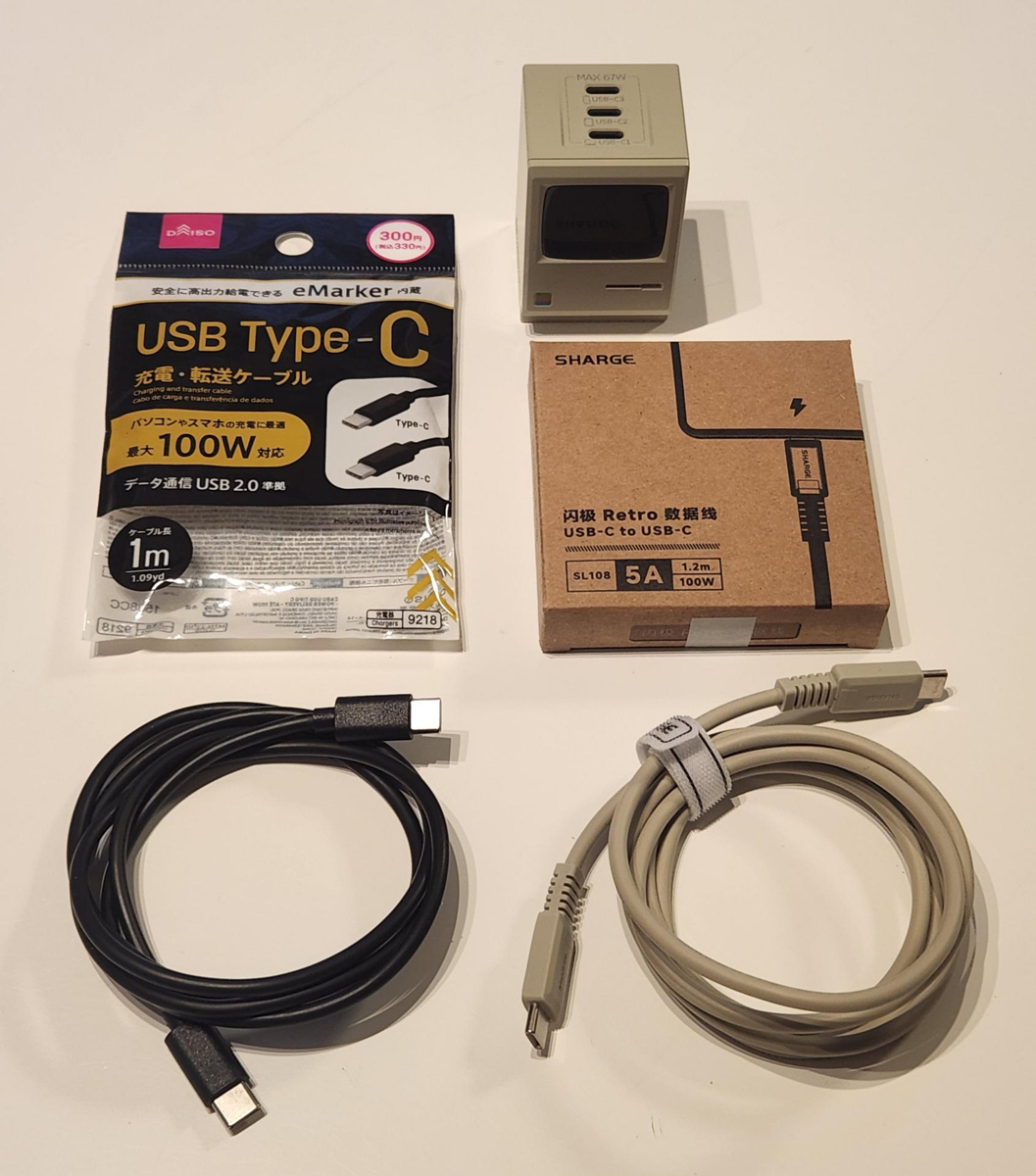そして今回同時に使ったほかの2本のUSB Type-Cケーブルは、筆者も複数本愛用している柔らかシリコン製のAnker PowerLine III Flow USB-C & USB-C ケーブル、そして意外と使い勝手が良く優秀なダイソーのeMarker内蔵USB Type-C(長さ1m・100W対応)のケーブルだ。価格が300円と言うのもありがたい。プアマンズパーフェクトUSBケーブルの最右翼だ。