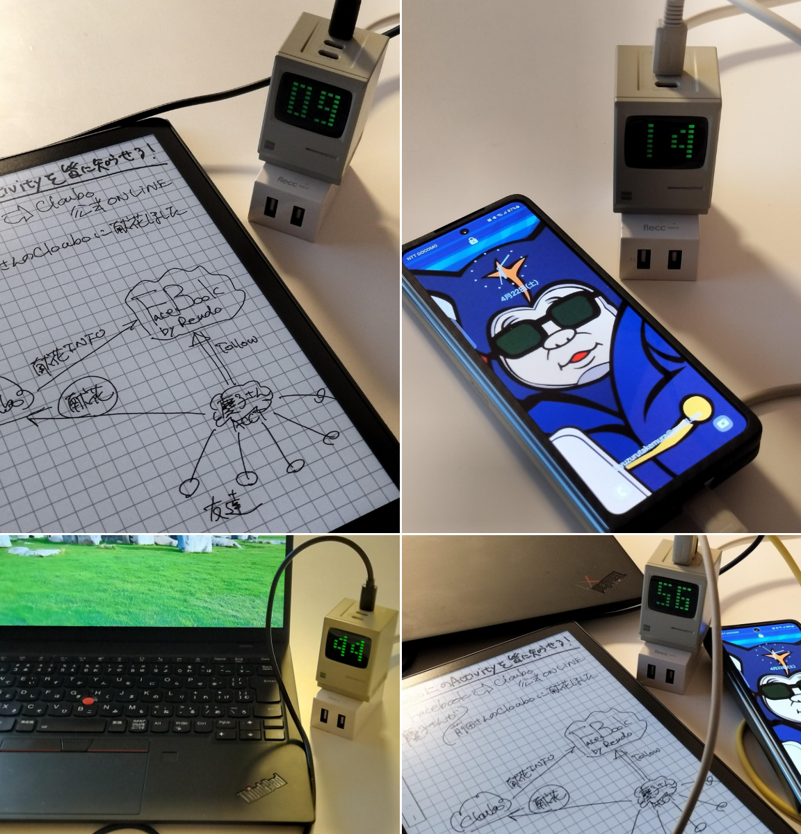 今回Kindle Scribeを単体充電したみたところ、ディスプレー上には常時9W〜10Wが表示された。同じく筆者のGalaxy Z Fold4を充電している時は14Wと表示され急速充電であることが分かる。そしてThinkPad X1 Nanoを充電中には44Wという出力値を表示した。最後に以上の3台を同時充電して見たら、Retro 67のディスプレーには56Wと表示されていた。最後にSHARGEのStorm2 Power Bankにも充電してみたが、いずれもスペック通り例外的なエラーや不都合はなかった。