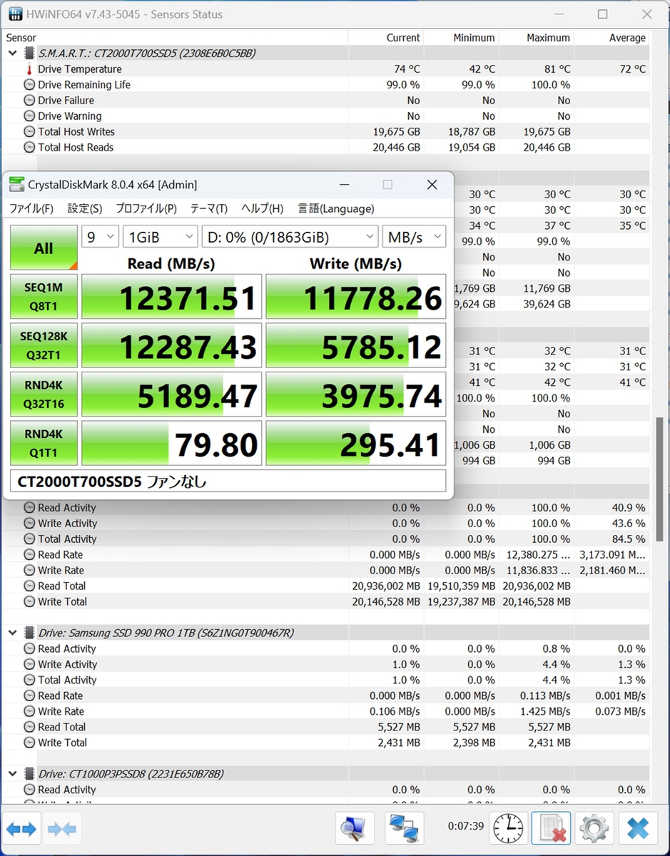 PCIe 5.0 NVMe SSDは、10GB/sを超えるアクセス速度と引き換えに、発熱量が増加している。この点はT700も同じだ。ESの影響もあるだろうが、エアフローのない環境では「CrystalDiskMark」を行っているだけで、サーマルスロットリングが発生する80℃に達することもあった。