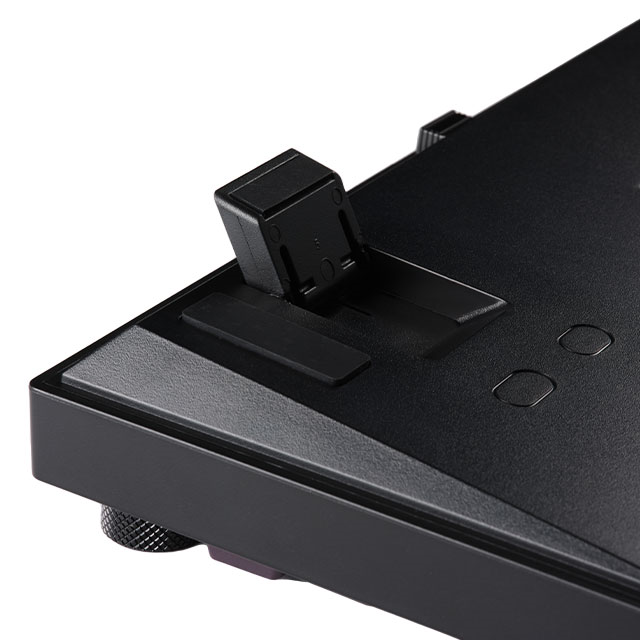 「UP-MKGA75」本体底面には、キーボード製品として当然ながら可変式のスタンドが装備されていて高さ調整に利用できる。スタンドを第1段階立てることで約7度、第2段階立てることで約10度の角度を設けてディスプレー側にあたる面を高くできる。筆者的には第2段階、約10度の角度がゲームにおいても文章作成においても使いやすく感じた。