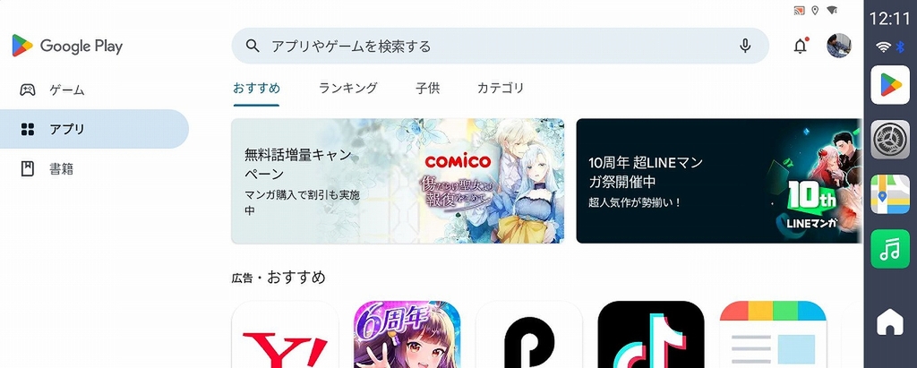 CarlinKit Tbox PlusはAndroid 12を搭載した、いわば画面のないスマホで、CPUに8コアのQualcomm QCM6125を採用し、メモリー4GB、ストレージ64GBを搭載したもの。SIMスロットもあるので、SIMを差せば4Gでの通信や通話もできる。そして面白いのが、Android Autoとして接続するのではなく、Apple CarPlayとして接続して、画面もApple CarPlayライクになっているところ。それでいて、Google Playが利用できるので、アプリを自由にインストールできる(後述するが、一部できないものもある)ので、YouTubeもPrime VideoもNetflixも見られるのだ。