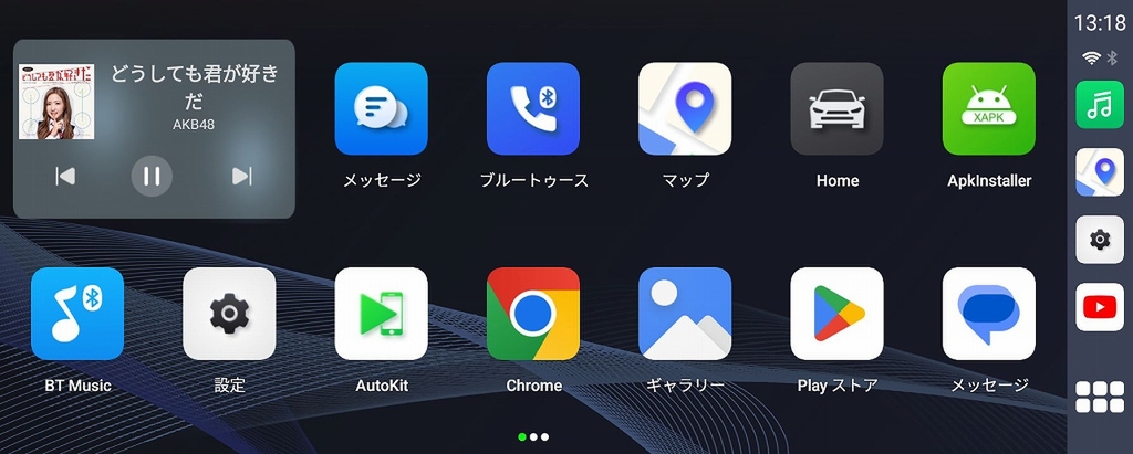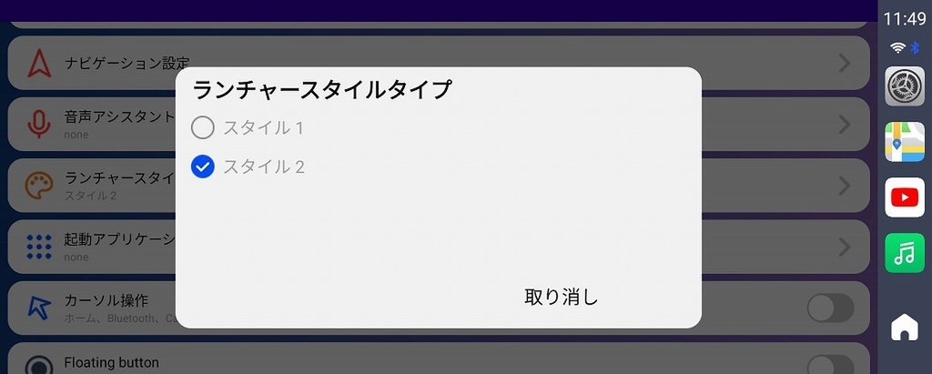 インターフェースは、Apple CarPlayライク(厳密にはAndroidの画面)なので基本的な操作で迷うことはないはず。ただ、設定部分がAndroidのようなので、iPhoneしか使ってない人はそこだけ戸惑うかもしれない。また、設定の「ランチャースタイルタイプ」でアイコン表示タイプか、2画面タイプかを選択できる。