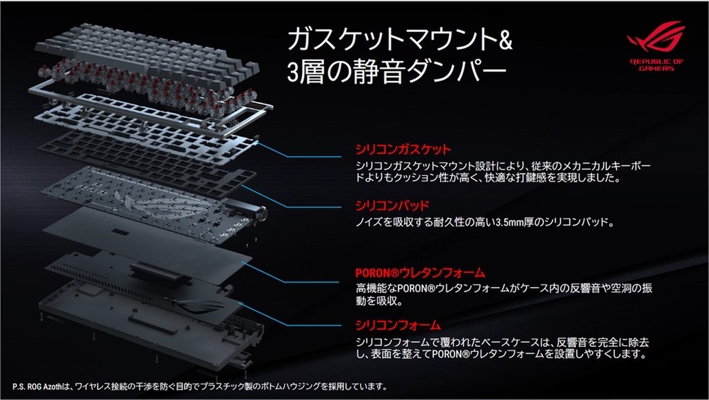 通常、キーボードを使用している時に生じる音は入力時に生じる打鍵音だけでなく、筐体に伝わる振動音も存在する。ROG Azothでは、この筐体内に生じる振動や反響といったノイズを低減させるため、本体内にシリコンガスケットやシリコンパッド、ウレタンフォーム、シリコンフォームといったノイズを吸収・吸音するレイヤーを配置した多層構造を採用している。こういった素材が敷き詰められているため、ややヘビーウェイトになっているのだが、静音性はかなりのものだ。