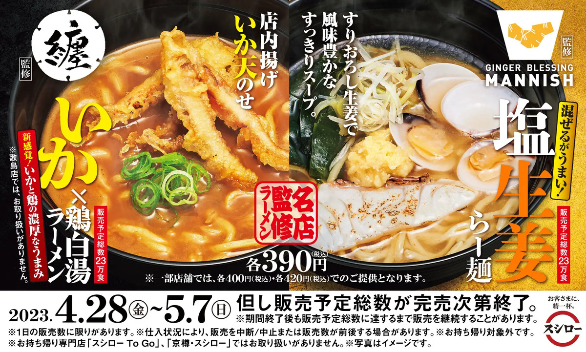 【GW限定】有名店の味をスシローで!「新橋 纏」、「MANNISH」監修ラーメンが390円でいただける