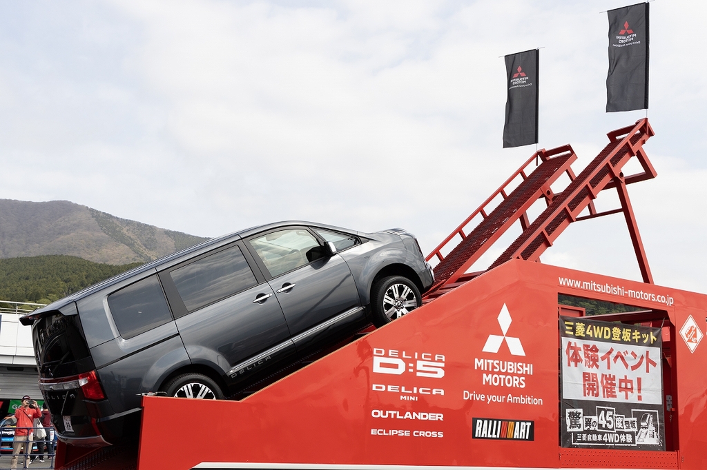 デリカD:5はグングン登坂。そして45度のポイントで停車! 「ほとんど垂直みたいじゃないですか!」とゆみちぃ部長は驚きの声をあげます。「停車しているというのがすごいです!」とデリカD:5の無限の可能性に感嘆しっぱなしです。