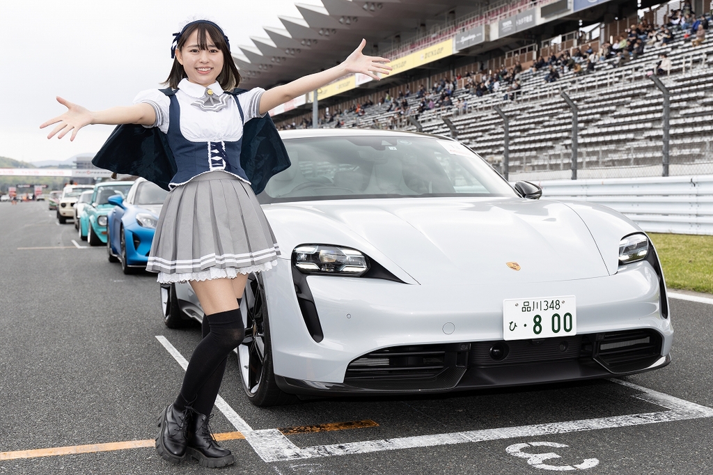 イベントの途中では、ホームストレート上に出展マシンが勢ぞろい。部長もポルシェ・タイカンの前で、レースクイーンポーズを決めました。実はこのインラップ、部長がこのタイカンを運転したのでした! その様子は別記事にて。
