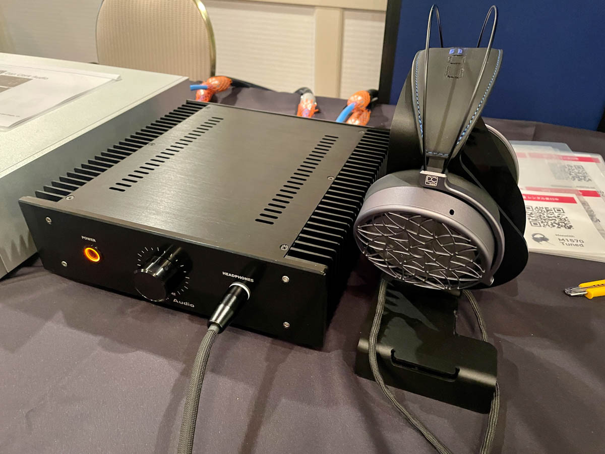 Dan Clark Audioの最新ラインナップ「Corina」も登場。これは独自のメタマテリアル技術である AMTSを採用したラインナップの静電型バージョンだ。静電型用のアンプはミョルニルオーディオの製品が使われていたがこれは参考品とのことだ。端子はSTAX Pro規格なのでSTAX用の静電型ドライバーでも使用できるのではないだろうか。