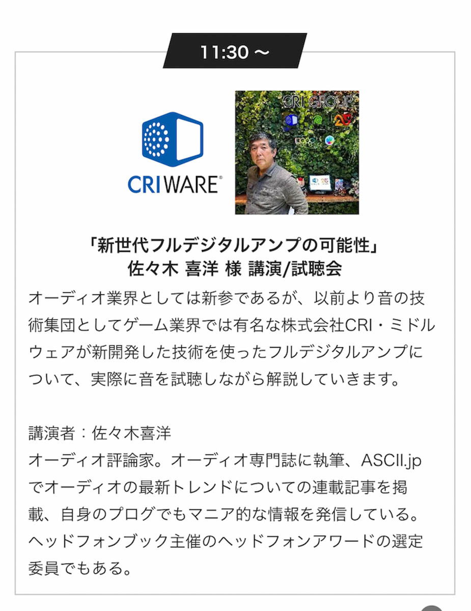 春のヘッドフォン祭 2023では、私自身もCRI・ミドルウェアのブースで「新世代のフルデジタルアンプの可能性」と銘打って講演をさせてもらった。アスキーの連載でも以前紹介したが、CRI・ミドルウェアの「D-amp」ドライバーの試作機を用いた解説と試聴のセッションである。立ち見が出るほどの盛況だったが、来場された方々にお礼を言いたいと思う。また、フルデジタルアンプというものに対しての興味がとても高まっているのを感じた。