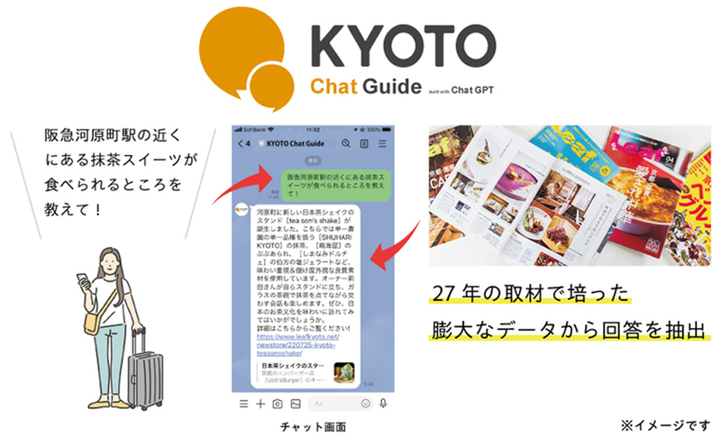 リーフ・パブリケーションズは5月1日、ChatGPTを活用したLINE公式アカウントを新たに開設し、京都を訪れる人や住む人を対象とした、チャット型情報提案サービス「KYOTO Chat Guide built with ChatGPT」のサービス開始を発表した。