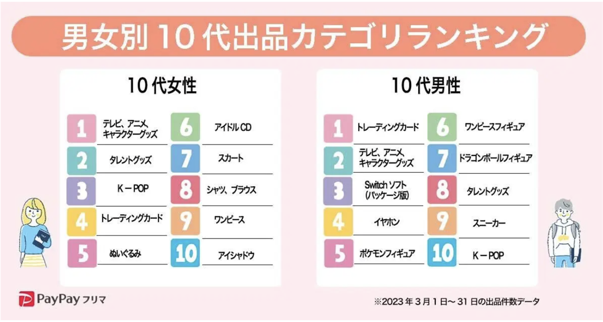 男性は「テレビ、アニメ、キャラクターグッズ」や「Switchソフト(パッケージ版)」「イヤホン」「ポケモンフィギュア」などのアニメやガジェット系の出品が多く、女性は「タレントグッズ」や「K-POP」「アイドルCD」「スカート」「シャツ、ブラウス」などアイドル関連やファッション関連の出品が多い。