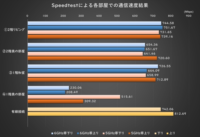 ただ、ほかの3部屋の結果を見ると、ルーター設置場所から水平方向と垂直方向には結構強いようで、参考として有線接続時の速度も計測すると、ルーターにいちばん近い2階リビングではかなり好結果を記録していることがわかる。